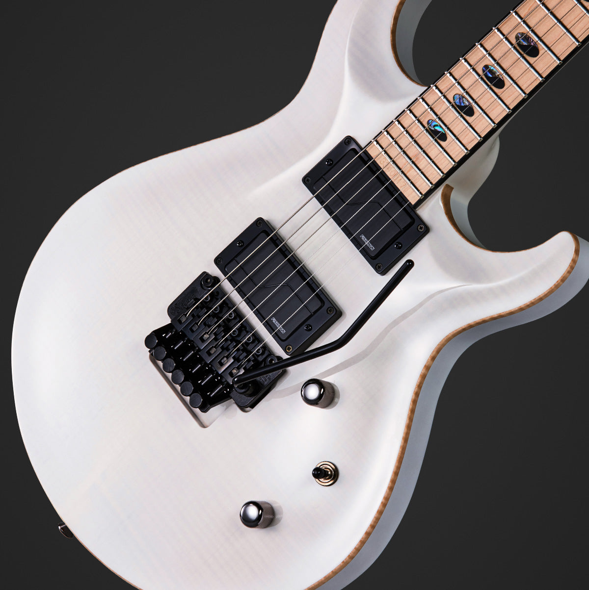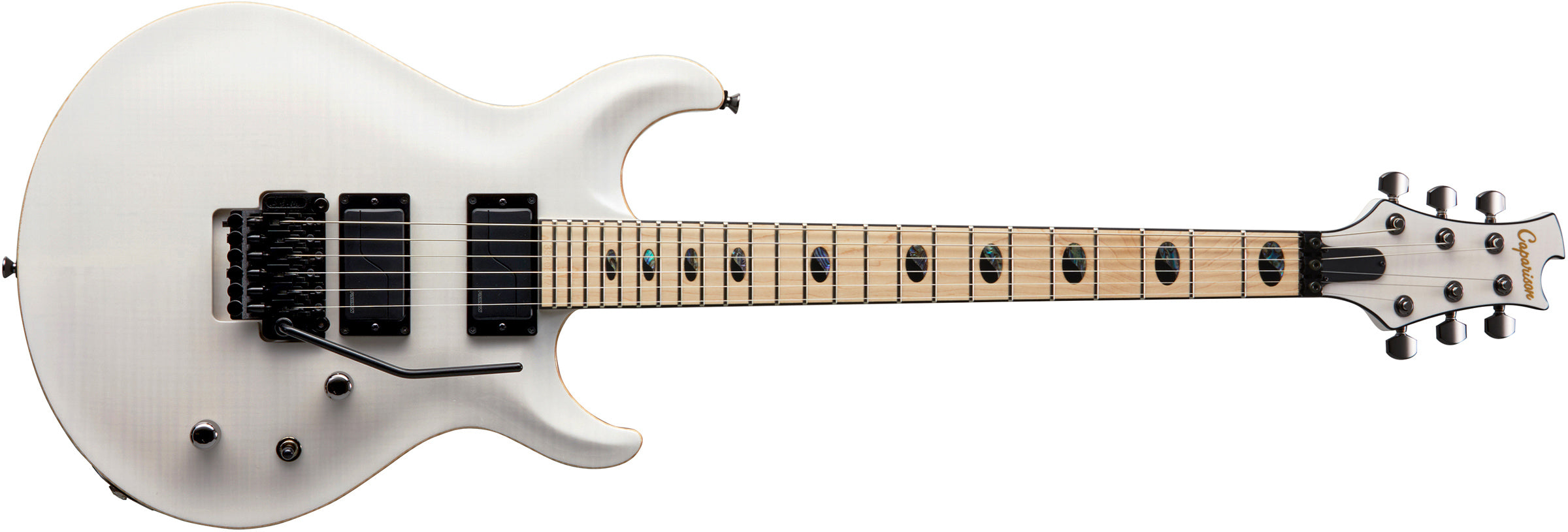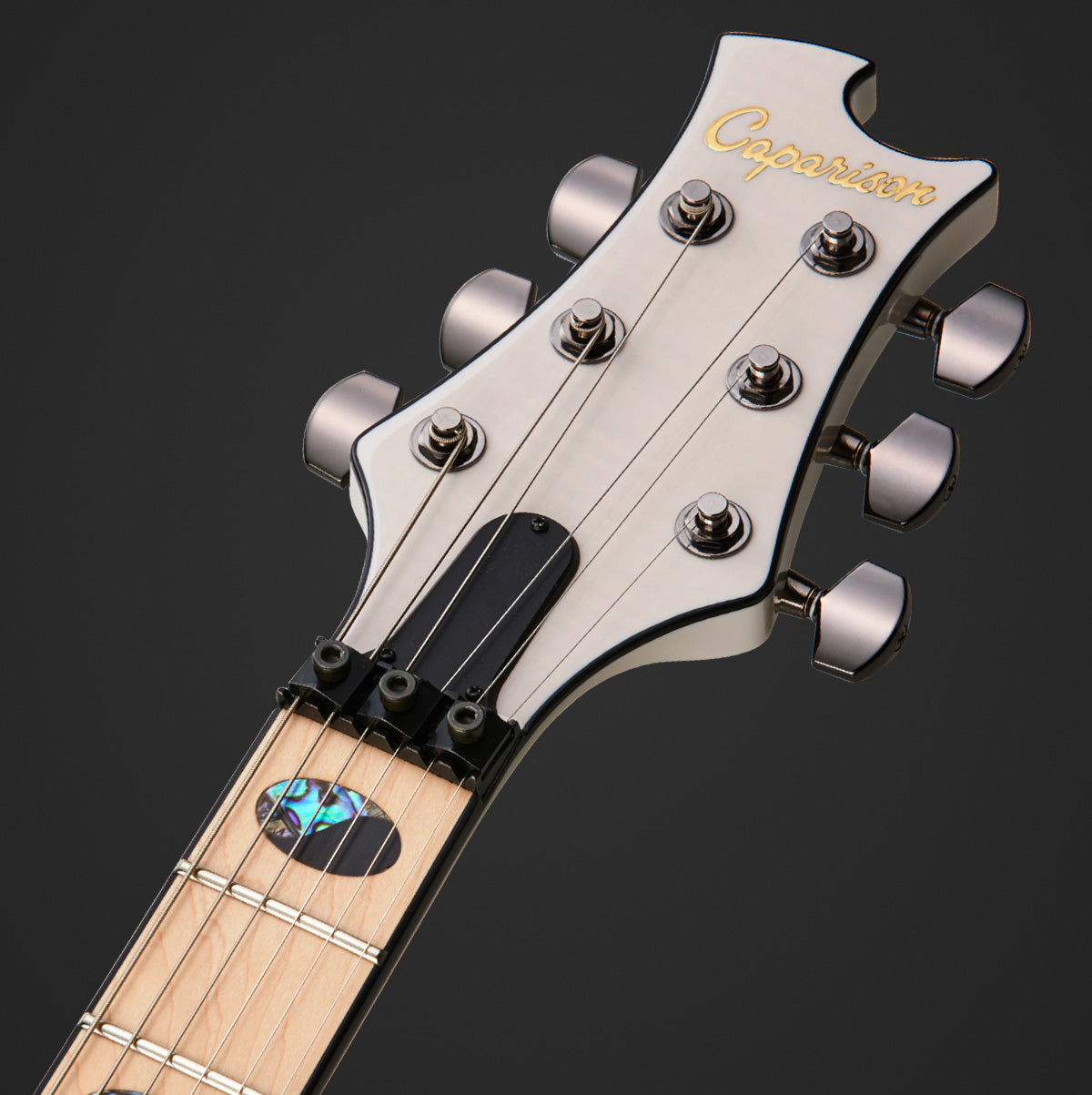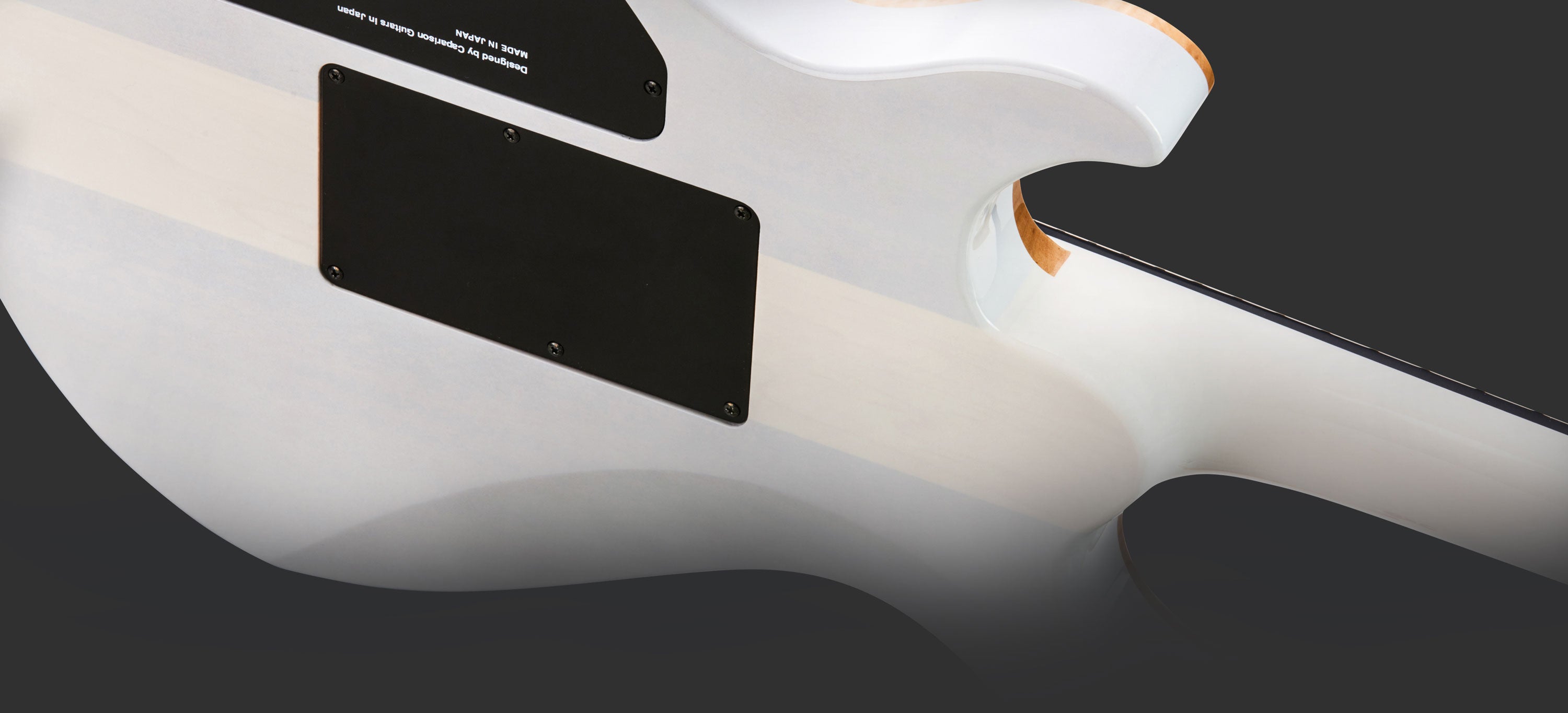 Trans.Whiteカラーのボディは、Caparisonオリジナルのボディ構造”M3B”を備えています。Angelusモデル独特の美しいアーチドトップのトップ材には厳選した5Aフレイム・メイプルを使用し、バック材には、ボディ中央のメイプル材とネックのメイプル材がセットネック方式でジョイントされる構造で、豊かなサスティーンを生み出します。両サイドのマホガニー材は、サウンドを整えレンジの広いサウンドを出力します。また、ボディサイドは、トップ材のフレイム・メイプル部分をナチュラルで残したバインディング調の仕上げです。