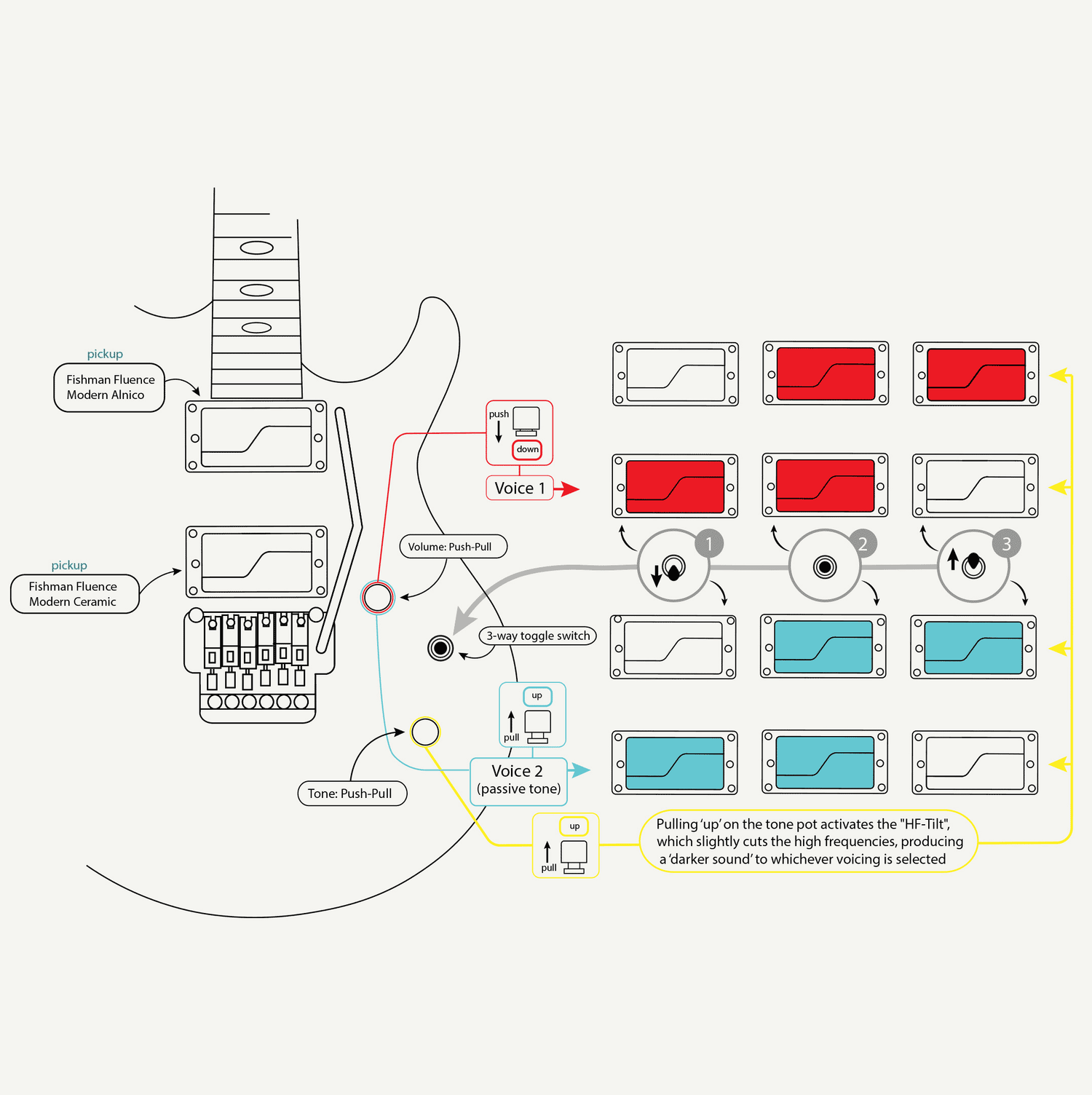 Fishman Fluenceピックアップ-セラミック(ブリッジ)とアルニコ(ネック)の組み合わせにより、ブリッジ・ピックアップでの高出力でタイトなローエンドのくっきりとしたクランチサウンドや、ネック・ピックアップでの豊かで明瞭なトーンまで、幅広いサウンドを得ることができます。また、ボリュームノブを引上げることでVoice-2(パッシブトーン)へ、トーンツマミを引上げることでHF-Tilt(高音域を僅かにカット)へ状況に応じてサウンドを変化させることができます。