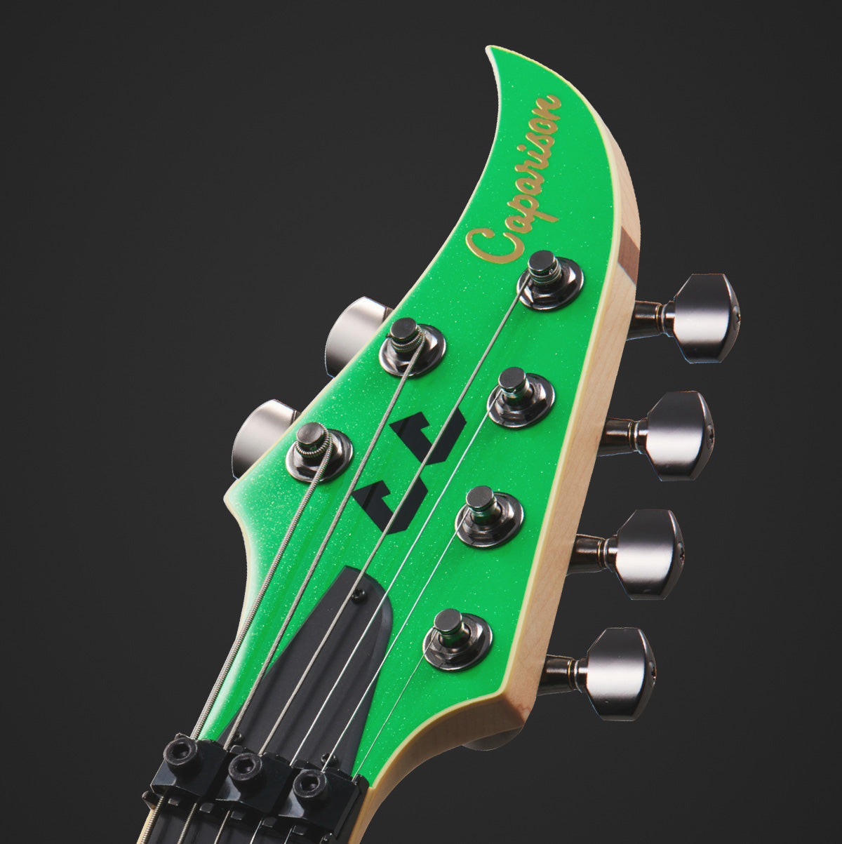 ボディとヘッドのカラーは、コートニーのリクエストによる”Metallic Green”、蛍光色に近い発色の鮮やかなグリーンカラーです。ヘッドにはシグネチャーモデルの証としてコートニーの”CC”ロゴ、コントロールバックパネルには、コートニーのサインがプリントされています。