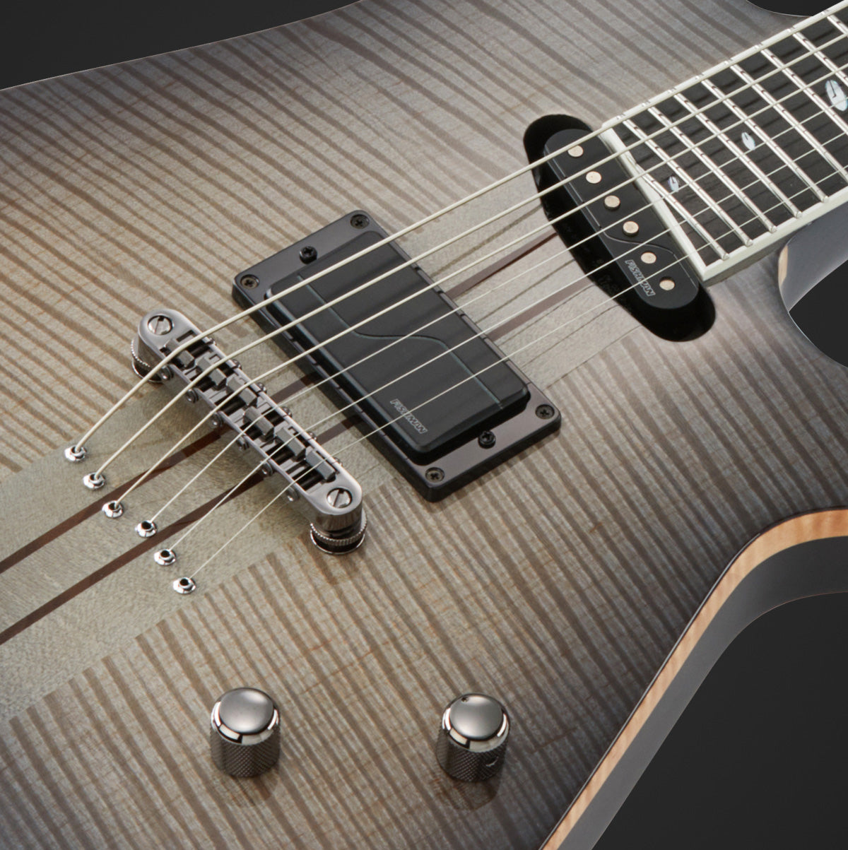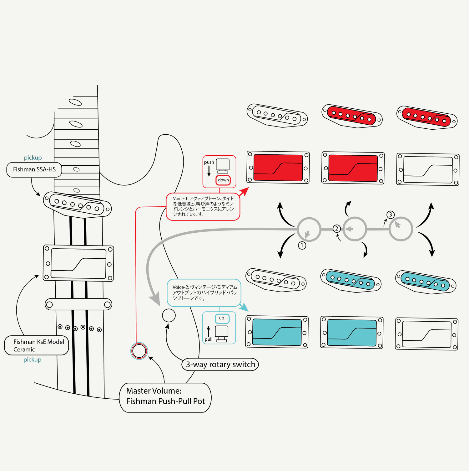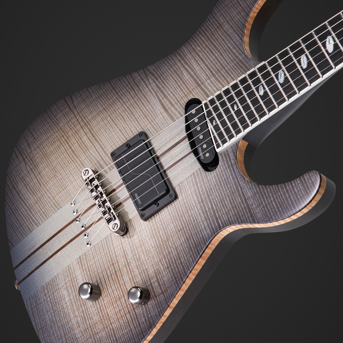 ボディトップ材に厳選したフレイム・メイプル、 ボディバック材にオーストラリアン・ブラックウッドを採用し、Custom Lineにふさわしい音質と美しい外観を実現しました。さらにネックピックアップにFishmanシングルコイルSSAを追加し、サウンドの選択が広がりました。ブリッジピックアップはお馴染みのFishman Killswitch EngageシグネチャーモデルCeramicです。マスターボリュームのノブを引き上げる事でVoice-2(パッシブに近いトーン)になります。
