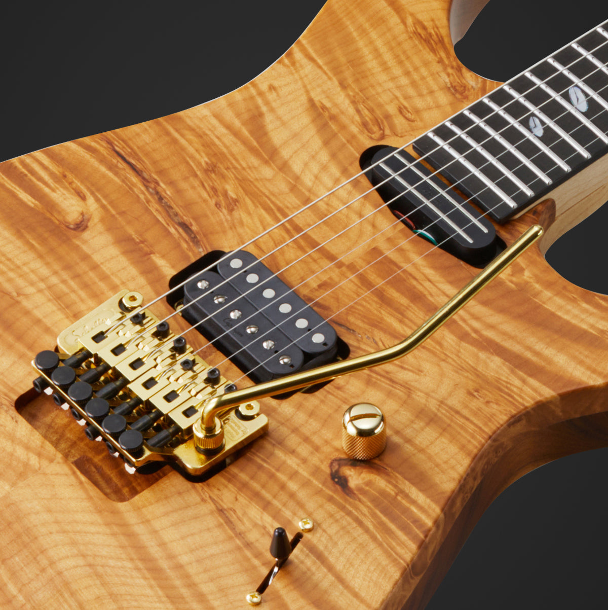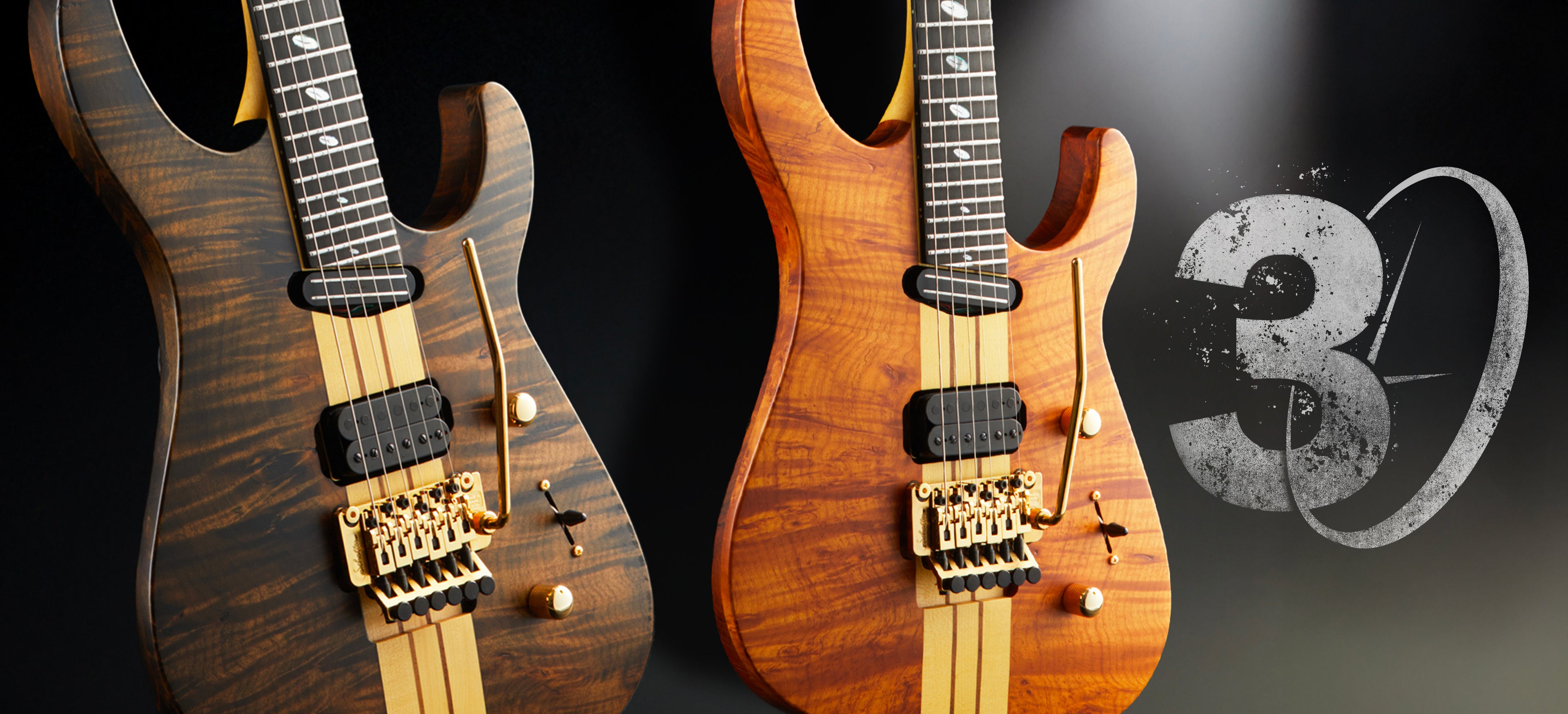 To celebrate Caparison Guitars’ 30th anniversary, we created a limited-edition instrument that embodies our dedication to craftsmanship, tone, and innovation. This project began with the discovery of a rare and visually striking slab of Burl Maple Radiant Grain—a unique and highly coveted tonewood known for both its aesthetic appeal and sonic character. True to Caparison’s design philosophy, this figured maple isn’t just a decorative top; it serves as a full 17mm-thick tonewood, directly shaping the instrument’s sound profile.