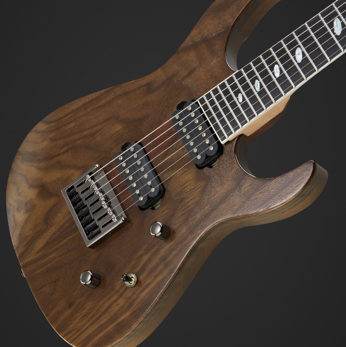 The newly constructed bipartite body composition now features a select Walnut top section with an Australian Blackwood foundation. This distinctive combination provides an engaging, sustain rich tone with exceptional clarity in the mid to high frequency range. It implements a well defined, clear and articulate note separation that is essential for a phonically extended 7 stringed instrument.